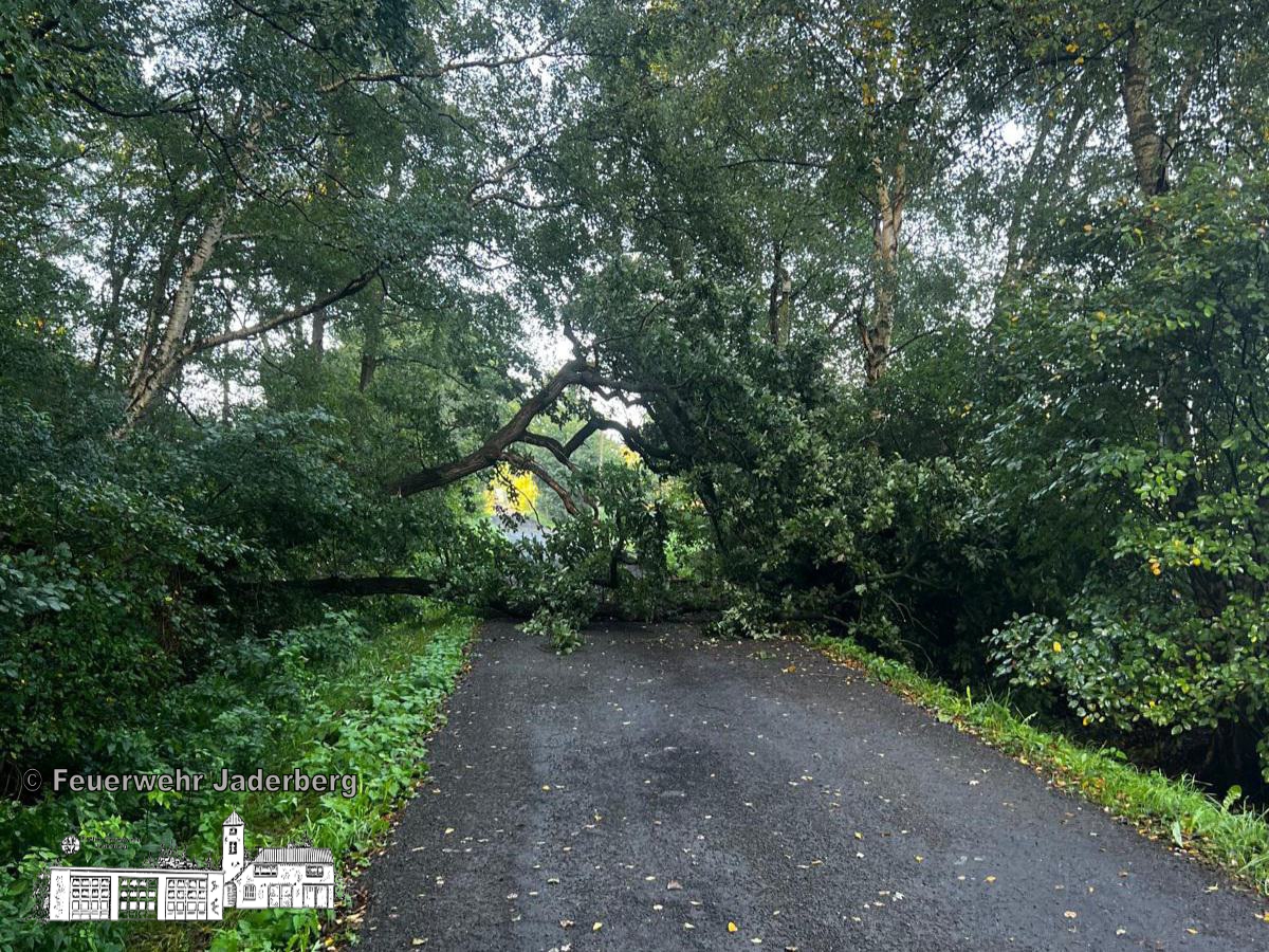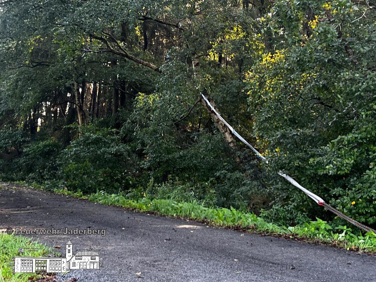 Vor Ort lag ein Baum auf der Straße und ein zweiter drohte ebenfalls umzustürzen. Die Einsatzkräfte beseitigten beide Bäume und nach etwa 1,5 Stunden war die Straße wieder frei.